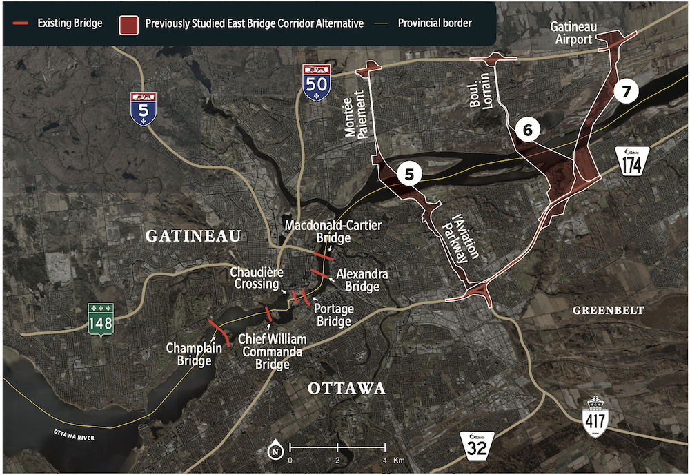 On the Québec side, the bridge would connect to Montée Paiement and Autoroute 50. On the Ontario side, it would link through the Rockcliffe and Aviation Parkways to the 417, thence down to Hunt Club Road, Highway 416, and ultimately to the 401. This would complete a long-missing freight corridor that would help regional traffic bypass the city core.